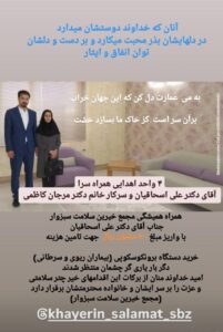 🔷ایشان بههمراه همسر محترمشان همواره حامی مجمع خیرین سلامت بوده و در راه اندازی همراه سرا امید بیمارستان واسعی ۴ واحد تکمیل شده تحویل مجمع نموده که مورد استفاده همراهان بیماران است.
