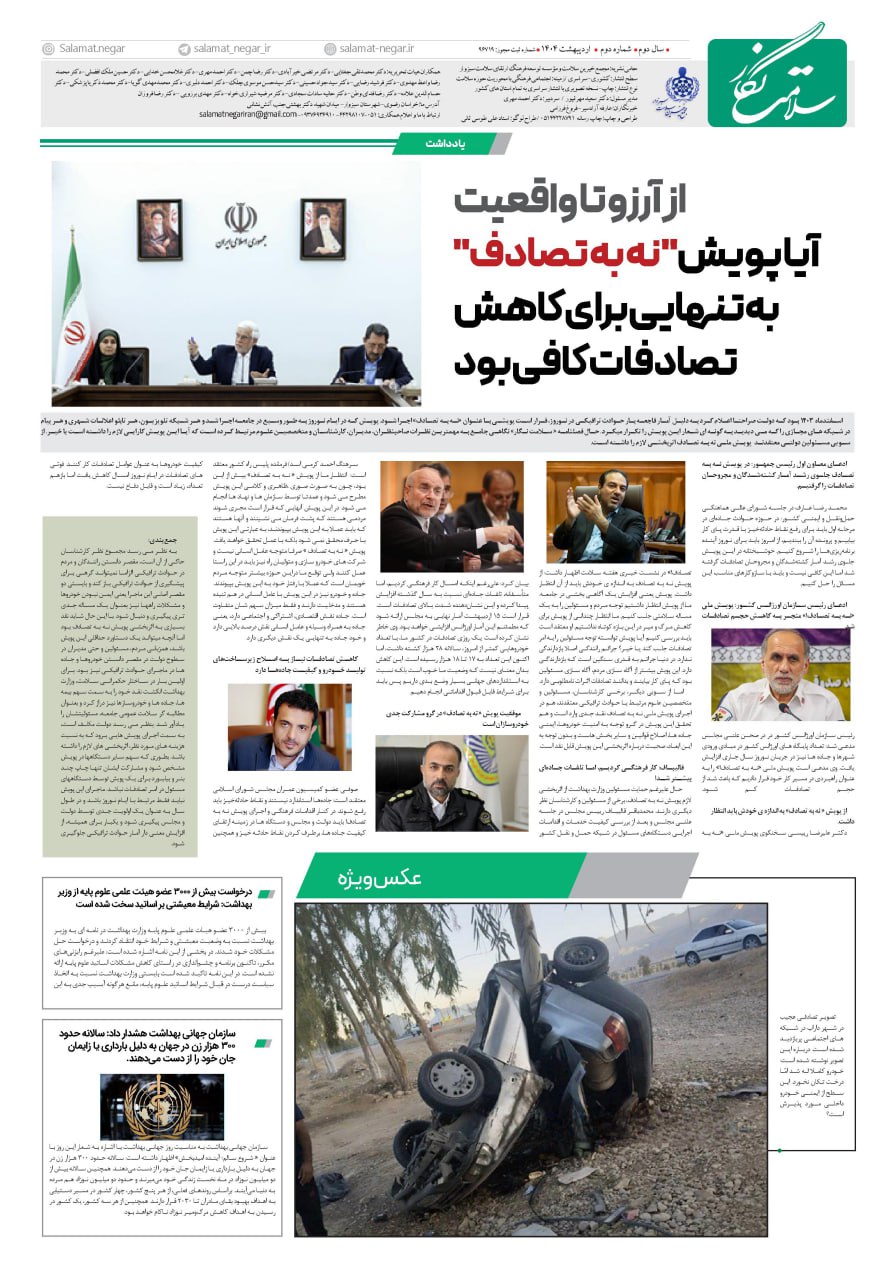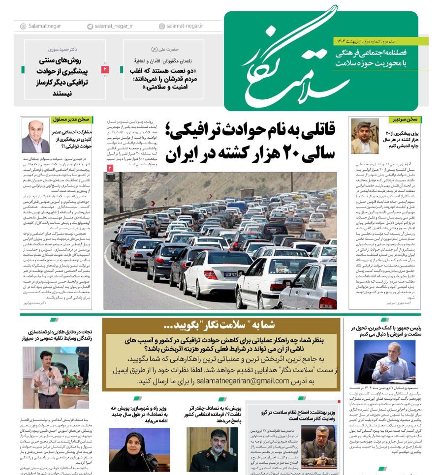 🔷انتشار این شماره از “سلامت نگار” در شرایطی صورت میگیرد که پویش ملی “نه به تصادف” از ابتدای سال ۱۴۰۴ با هدف کاهش آمار نگرانکننده تصادفات و افزایش آگاهی عمومی در سراسر کشور آغاز شده است. لذا در این شماره در راستای همافزایی با این پویش، تلاش شده است تا با ارائه تحلیلهای کارشناسی، آمارهای بهروز و راهکارهای پیشگیرانه، به سهم خود در تحقق اهداف این حرکت ملی مشارکت نماید.