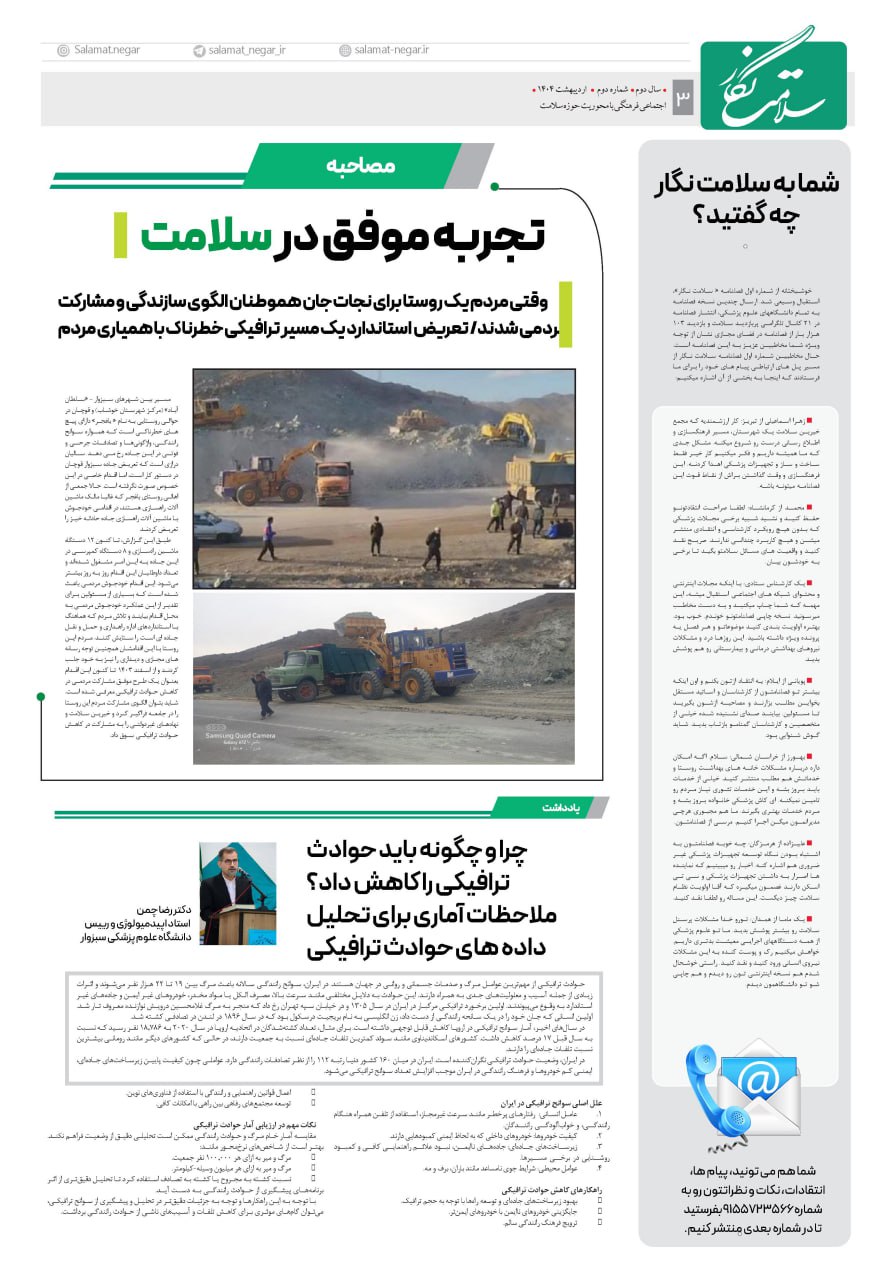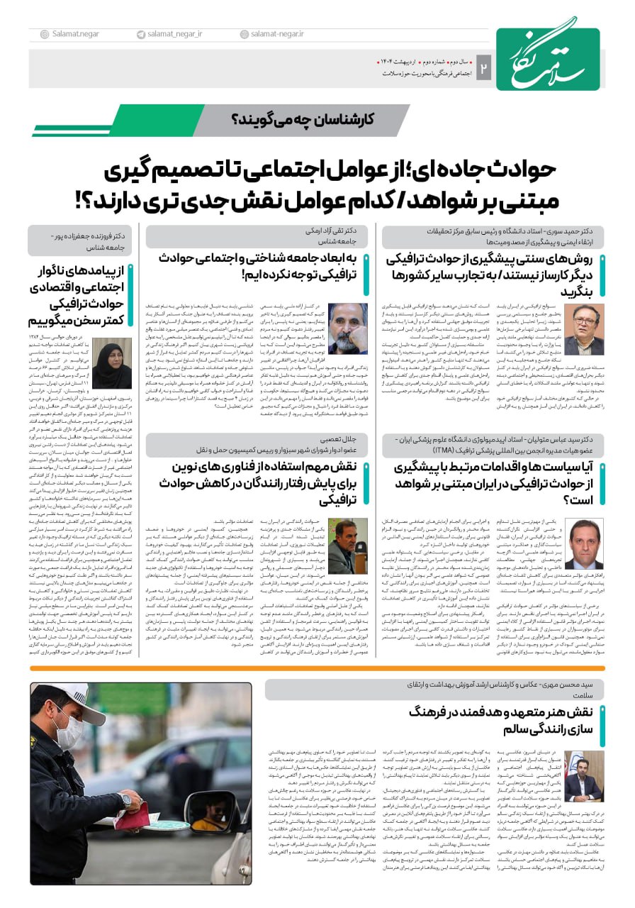 🔷همچنین در این شماره از “سلامت نگار”، خوانندگان میتوانند منتخبی از مقالات، گفتگوها و … را مطالعه کنند که به ابعاد مختلف تصادفات، از جمله عوامل انسانی، جادهای، وسیله نقلیه و همچنین نقش قوانین و مقررات و مداخلات آموزشی در پیشگیری از وقوع حوادث ترافیکی میپردازند.