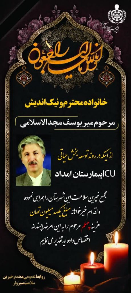 🔷 خانواده آن مرحوم در اقدامی خداپسندانه، هزینه مراسم چهلم را به ارزش ۱۰۰ میلیون تومان به‌منظور توسعه و ارتقاء بخش ICU بیمارستان امداد در اختیار مجمع خیرین سلامت قرار دادند. اقدامی که نه‌تنها باقیات‌الصالحات ماندگاری برای آن مرحوم به‌جا خواهد گذاشت، بلکه نقشی حیاتی در ارتقاء زیرساخت‌های درمانی منطقه ایفا می‌کند.